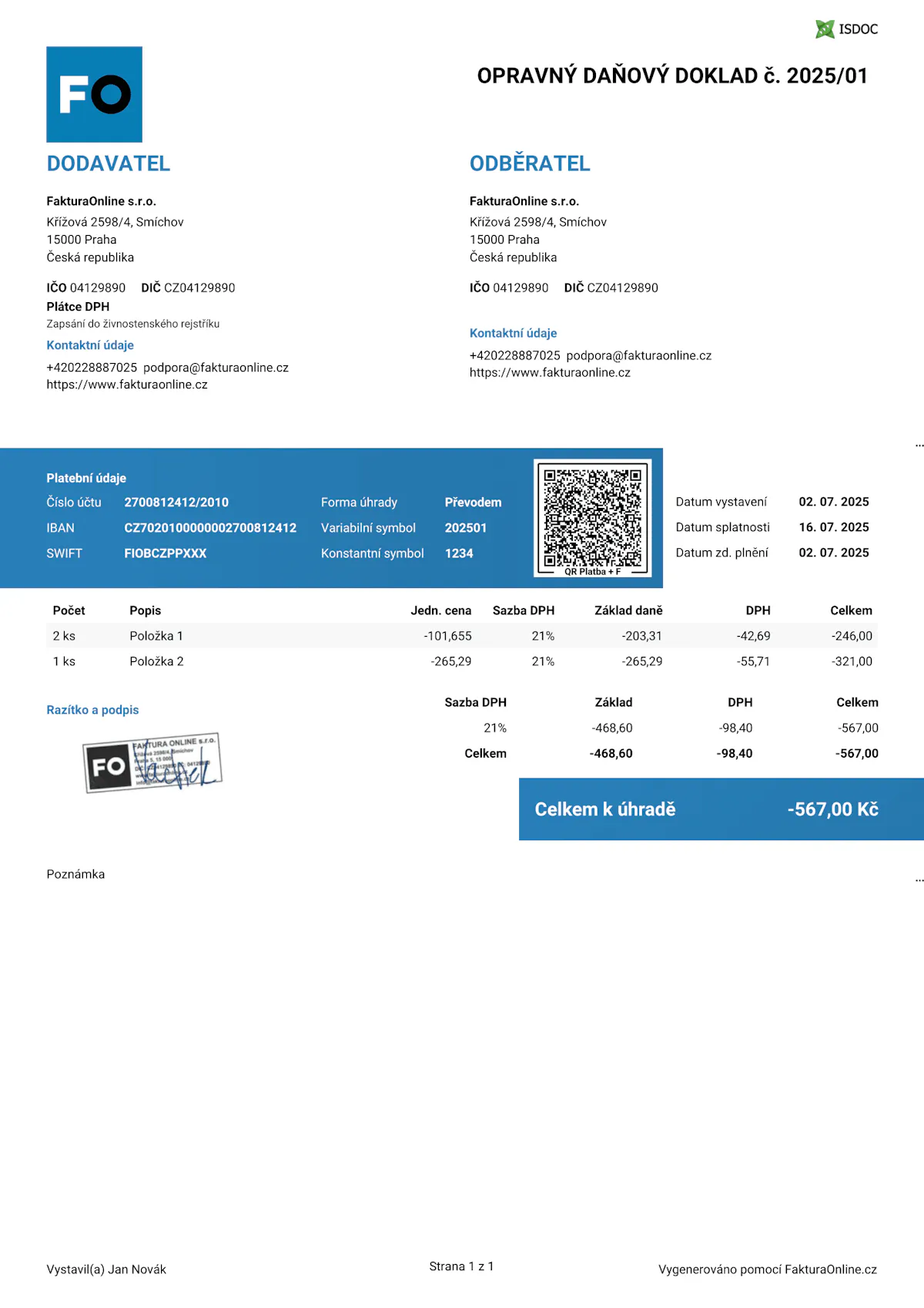 Na FakturaOnline.cz vygenerujete opravný daňový doklad přímo k existující faktuře – jedním kliknutím: