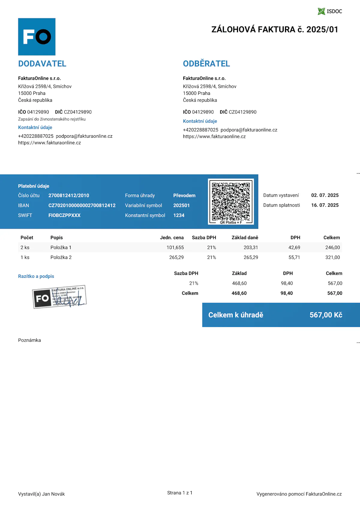 Zálohová faktura není daňový doklad. Neoznačujte ji jako „daňový doklad". Pokud jste plátce DPH, daňový doklad vystavíte až po přijetí zálohy – jako samostatný doklad k přijaté platbě.